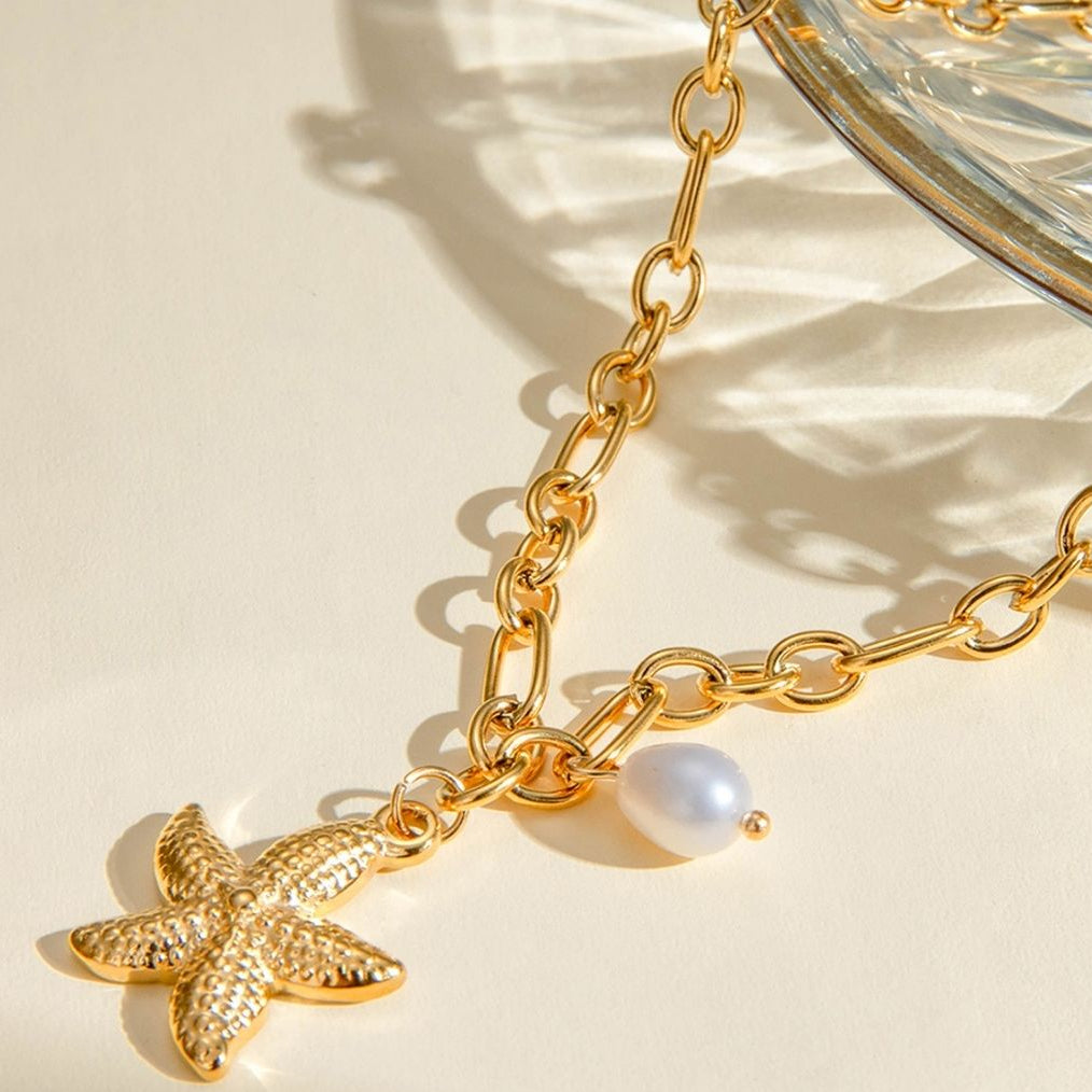Collier élégant symbolisant une étoile de mer avec une perle nacrée.